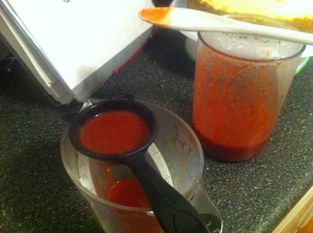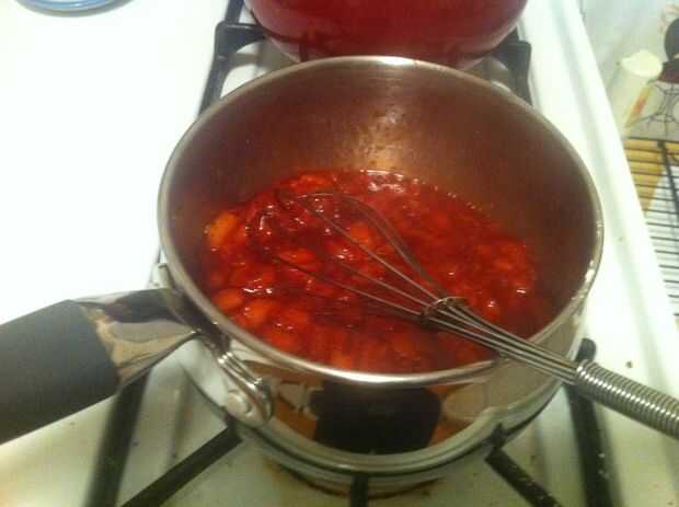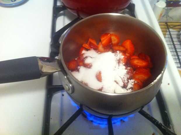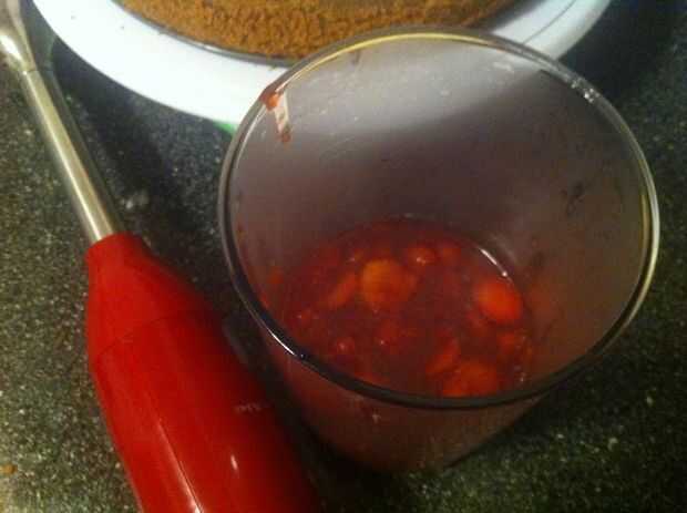 Ahora necesita hacer sus salsas. Volcar sus fresas, el azúcar y la maicena en una olla pequeña y llevar a ebullición. Revolver constantemente y cocinar por unos minutos, hasta que la salsa espese un poco. Retirar del fuego y tirar de que batidora nuevamente hacia afuera. Licuar la salsa y colamos por un colador para quitar las semillas.