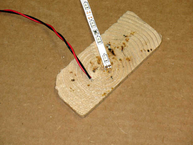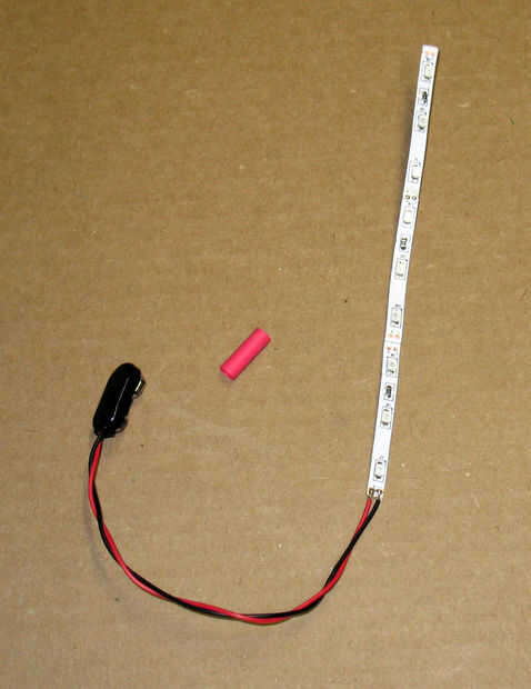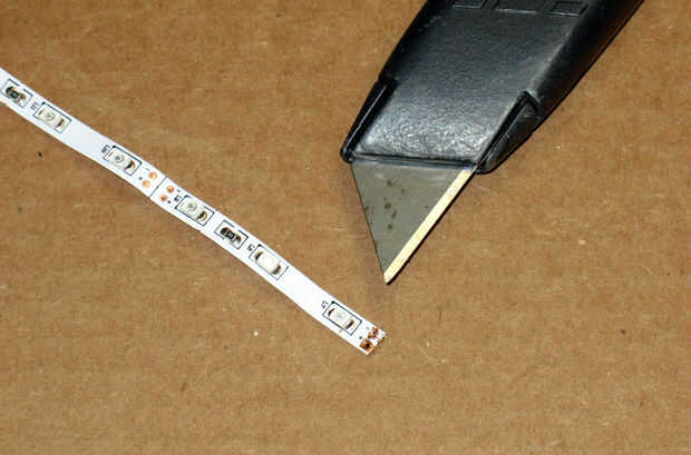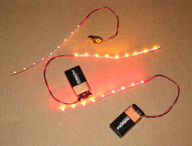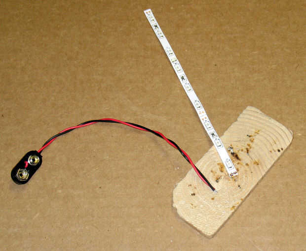 Usar un soldador para estaño las pastillas en un extremo de la tira de LED, y lata lleva el clip de la batería de 9v. Luego soldar los cables a los cojines.