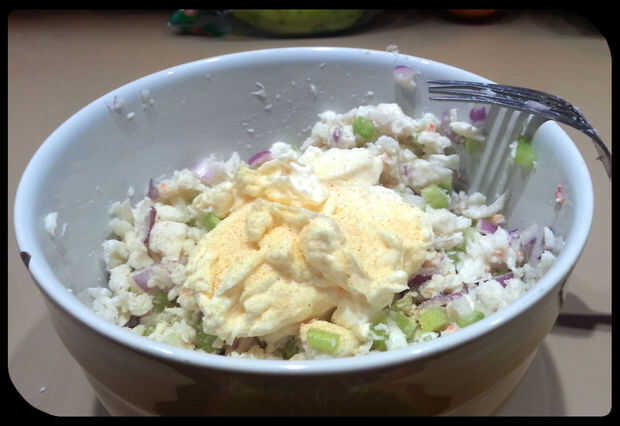 A la mezcla de cangrejo, añadir la mayonesa, salsa dulce y ajo granulado. Yo siempre empezar con media taza de mayo y una cucharadita de condimento dulce y ajuste hasta por cata. Mayonesa y condimento varían mucho entre las marcas en términos de sabor, dulzor y acidez. Las cantidades que figuran en los ingredientes son los finales que llegué a las marcas que se muestra en la foto.