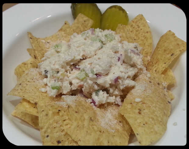 Decidimos disfrutar de nuestra ensalada de cangrejo en algunos chips de tortilla con un poco de parmesano rallado fresco y chips de salmuera de eneldo.