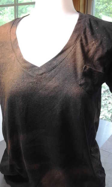 Suavemente la niebla su camiseta. Como magia, todo lugar que toca una gota de lejía, se quita el color. Negro se vuelve marrón y Marina se vuelve rosa.