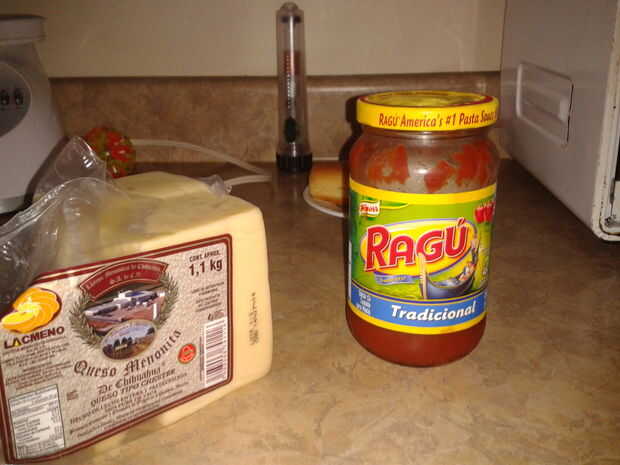 voy a compartir mi merienda favorita. Pizza de pan francés!Es rápido, fácil y barato... para no hablar de YUMMY!!Paso 1: ingredientes ~ Pan francés... $0,99~ salsa de spaghetti (o pizza salsa cualquiera)... $2,00 pero dura un buen tiempo~ queso de su