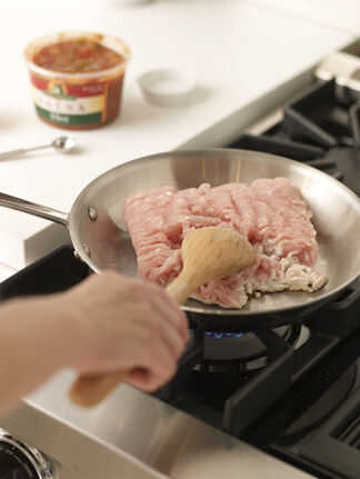 Añadir el pavo en un sartén y cocine, desmoronando con el dorso de una cuchara de madera hasta que no quede ningún rastro de color de rosa, unos 7 minutos.