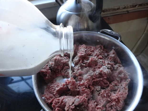 -En una cacerola grande saltear calor el aceite de oliva. Agregar la carne molida y el ingrediente secreto: leche entera! la leche mantiene la carne húmeda y tierna.