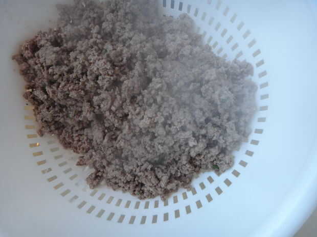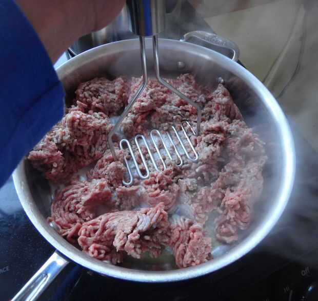 -Añadir el perejil, cebolla en polvo y pimienta negra. Usar un machacador para separar la carne molida.