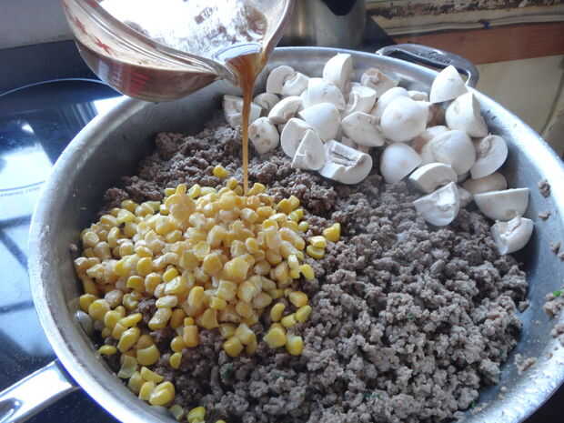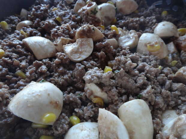 -Añadir setas, maíz y la torta de pastores preparados condimentos congelados.