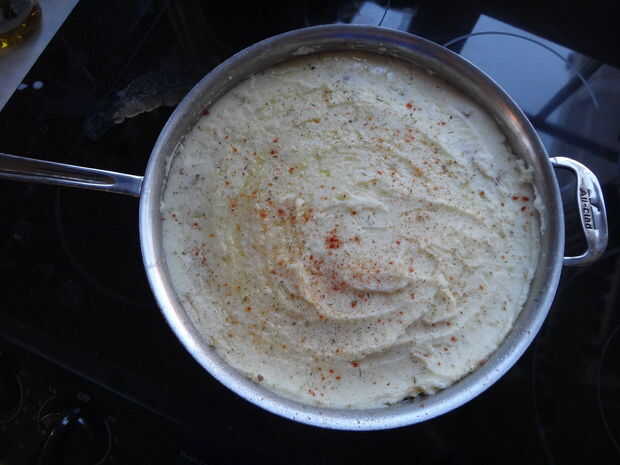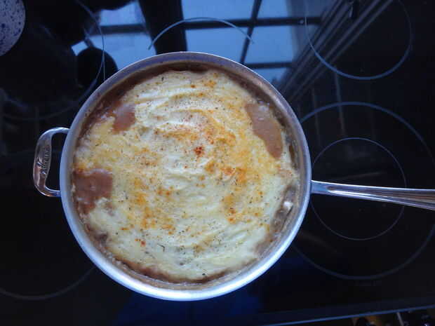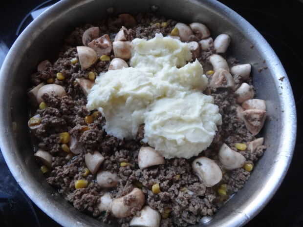 -Cuchara de puré de patatas en la parte superior del relleno de carne y alíselo.