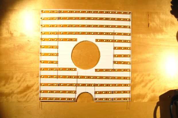 Recuerde que usted necesita cortar la tira de LED en los lugares marcados. Esto significa que usted no llena toda el área alrededor de características como el círculo en el centro. Yo pude han añadido otra pequeña franja va en ángulo recto a la derecha de las otras tiras alrededor del agujero para llenar el vacío, pero tengo vagos!