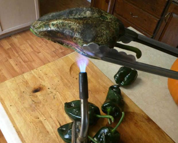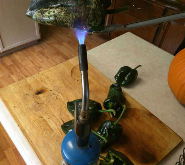 Usando las tenazas de mango largo rápidamente mover los pimientos y hacia atrás delante de la antorcha, la piel comenzará charing inmediatamente. También pop y chisporroteo de la multa, que es sólo la humedad en los pimientos da vuelta al vapor debajo de la piel ardiente.