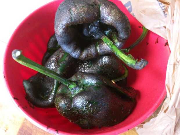 Después ha hacerles vapor, lavar los pimientos bajo agua fría corriente (usar guantes!). Pelar el chile, retire y deseche la piel, cortar una hendidura en el lado y retire las semillas y las venas.