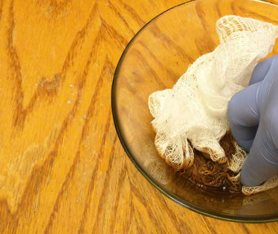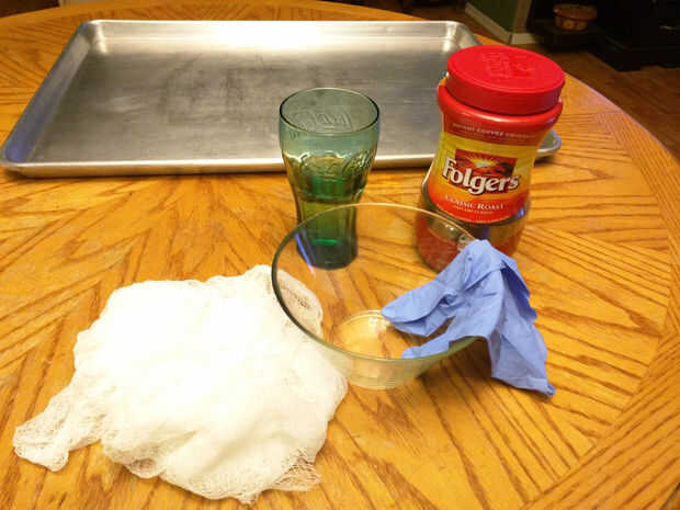 Tomar el recipiente y poner aproximadamente 1/2 taza de café instantáneo en la parte inferior y añadir suficiente agua caliente para hacer un colorante extra fuerte, sumerja el paño de queso en la mezcla de café, asegúrese de que está completamente saturado, exprima el exceso de café. (el secador, mejor)