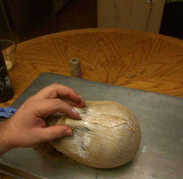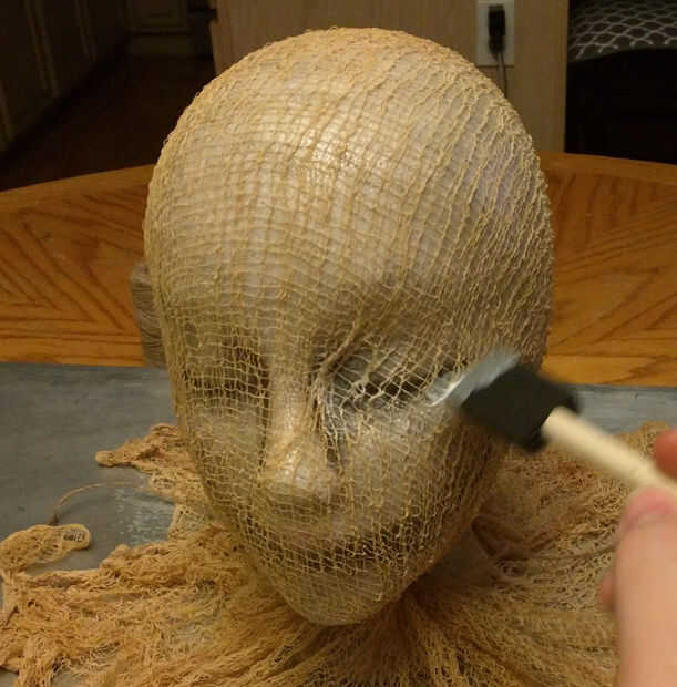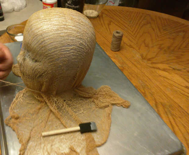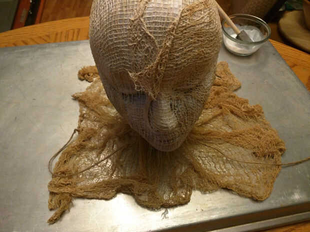 Incluso puede cortar pequeños pedacitos de la tela de queso desde el borde inferior para cubrir en toda la cara para ocultar los rasgos un poco más, cuando todo el paño de queso se adhiera a la cabeza - colocar el paño de queso sobrante alrededor de la parte inferior sin embargo te gusta.