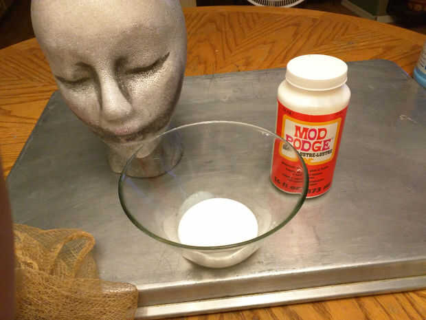 Usando un cepillo de espuma limpio sumergido en el mod podge se adhieren el paño de queso a la cabeza de artesanía de espuma.