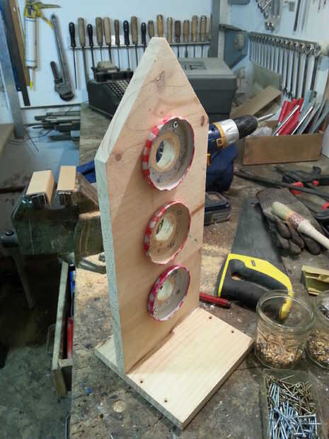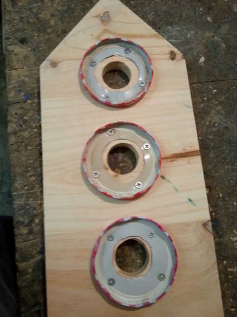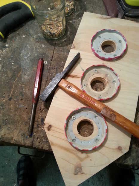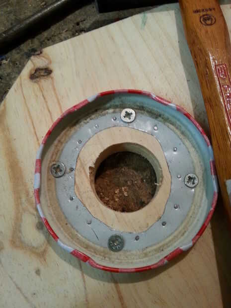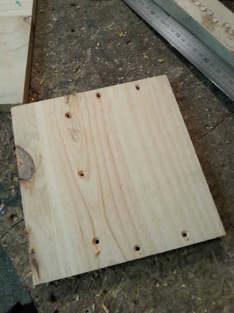 4 - tornillo de la tapa en forma de casa de madera. Utilice algunos mails para colocar el metal de la tapa lo más cerca posible de la madera.