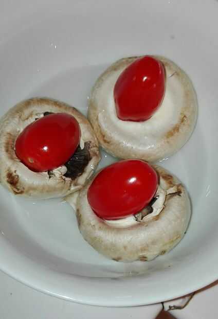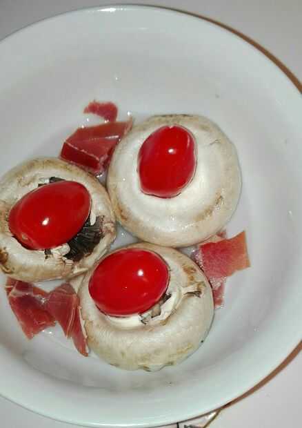Lugar sus champiñones sin tallo en un lugar seguro de microondas del tazón de fuente y agregar algunos jamón serrano, y suficiente agua para cubrir el fondo y un poco más. Un tomate puesto en el hueco que dejó el tallo eliminado.