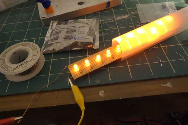 Se trata de una luz de seguridad con LED para impresión blanco y negro en un cuarto oscuro tradicional. La virtud de este diseño es que es rápido, fácil y barato para construir, sobre todo el recinto. Si era un purista, habría comprobado el espectro de emisión de mi LED, pruebas de fogging, retocado el brillo, etcétera. Yo no he hecho nada de eso, pero puedo atestiguar que obtener iluminación decente de mi pequeño (aprox. 8 x 10 pies) espacio y obtener impresiones agradables con papel Ilford Multigrade. Esta luz de seguridad utiliza 0,3 W de potencia, comparado con cerca de 15 W para una luz de seguridad tradicional con un foco incandescente y un filtro.