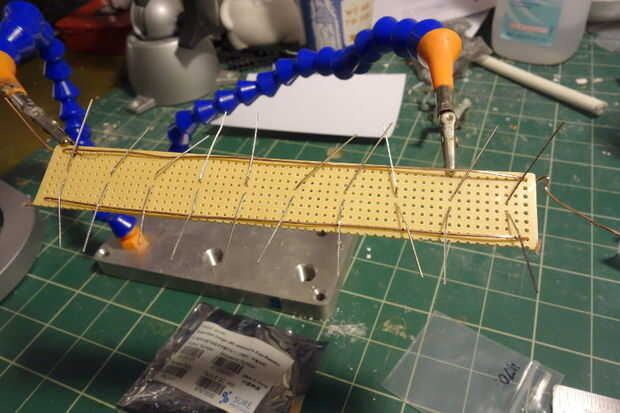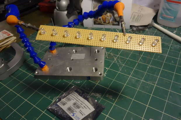 Corrí a una longitud de alambre de cobre desnudo en la parte superior de la perfboard para servir como una guía de alimentación y un cable de tierra similares a través de la parte inferior. Puse los LEDs entre intervalos equidistantes, prestando atención a la polaridad del LED - la pata larga tiene que conecte a la corriente.