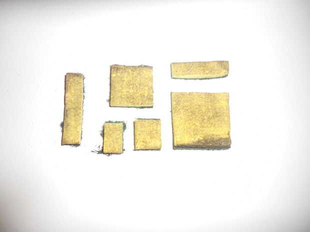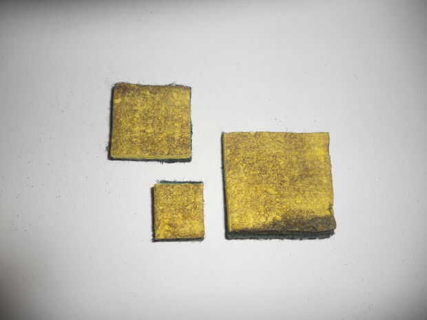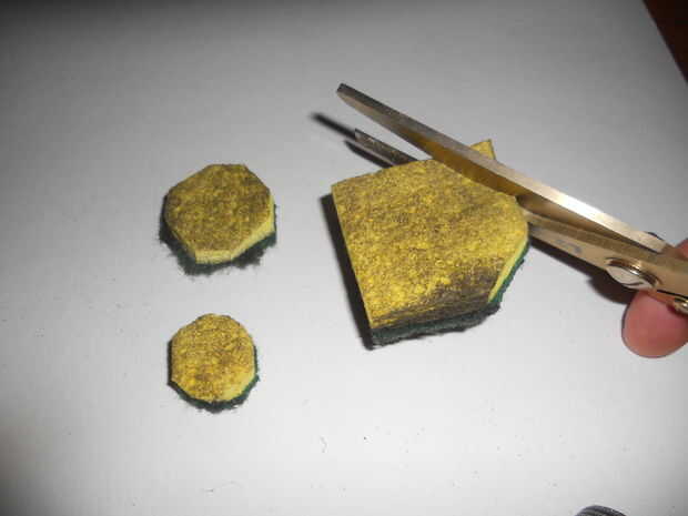Usando tus tijeras, proceder a cortar la esponja vieja seca en tres plazas, un cuadrado de 2", 1.5" cuadrado y un cuadrado de 1", como en la foto. Recortar las esquinas de las plazas para hacer 3 octógonos, luego hacer todo lo posible para continuar el redondeo de las esquinas para hacer 3 círculos de 2", 1.5" y 1" de diámetro.