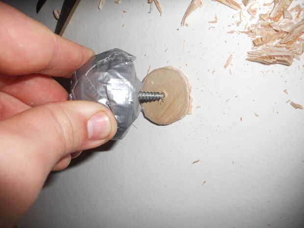 No atornille el círculo de madera completamente hacia abajo en la bola de esponja, sin embargo, que en última instancia se utilizarán para sujetar la lija sobre la bola de lijado. Dejando 1/8 o lo dará espacio para deslizar el papel de la arena entre la bola de la esponja y la madera de la capa antes de sujeción hacia abajo.