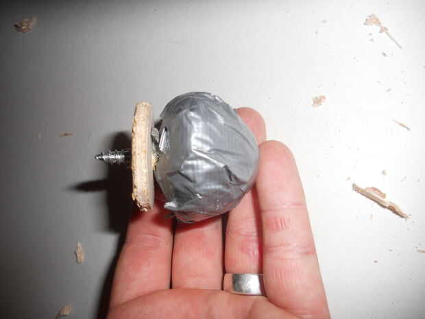 Marque el centro del círculo de madera contrachapada y atornille el conjunto de bolas lijado a través. Una vez más, un agujero piloto puede ser necesario para un más pedazo de chatarra, pero pude pasar esto como si fuera una galleta.