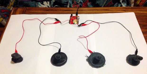 Uso táctil capacitiva sensor permite nos dirige sólo 1 alambre de cada timbre. También le permite hacer más divertidos estilos de zumbadores! En lugar de sólo un botón regular, concursantes pueden utilizar todo lo que es clase de conductor como un plátano, un coco, una taza de agua, una tortuga del animal doméstico con un trozo de cinta de cobre sobre ella, o una pieza de metal. Echale un Makey Makey para todo tipo de táctil capacitiva inspiración: http://www.makeymakey.com/