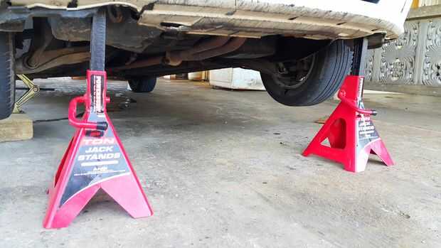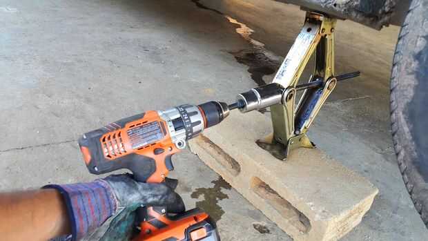 usé mi taladro accionado coche gato para aumentar rápidamente el coche. Usé un bloque de hormigón para ayudar a dar la elevación adicional necesitada.