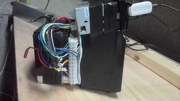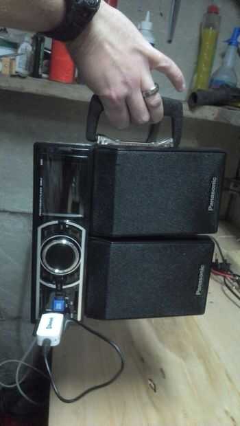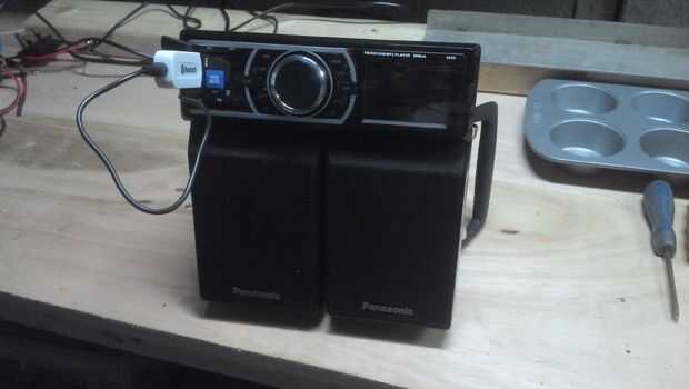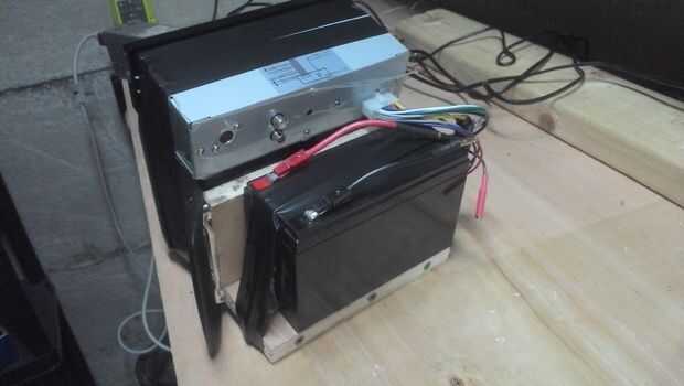 Hice un estante de madera contrachapada para mi batería y atornillados a mis altavoces usando los agujeros de montaje integrados en ellos. La batería es atada con un trozo de fleje de acero y la unidad principal se sujeta con cinta aislante!