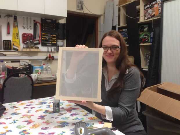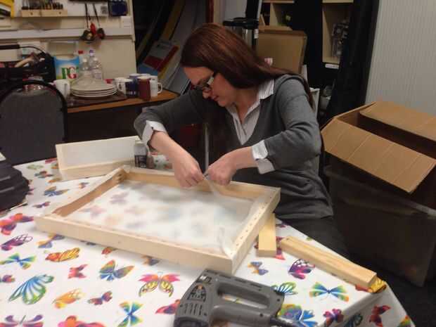 En primer lugar, cortamos la malla muy áspero el tamaño correcto, con un margen generoso todos redondos de 6 pulgadas. La malla debe ser absolutamente liso y tenso sobre la pantalla, por lo que es realmente un trabajo de dos hombres! Empieza fijando el centro de los dos lados más largos, entonces el centro de los dos lados más cortos, luego poco a poco su forma de trabajo hacia fuera de cada uno, alisando con cuidado mientras avanzas. Fijamos nuestro acoplamiento con grapas. Una vez que habíamos fijado la malla en su lugar, recorte el exceso.