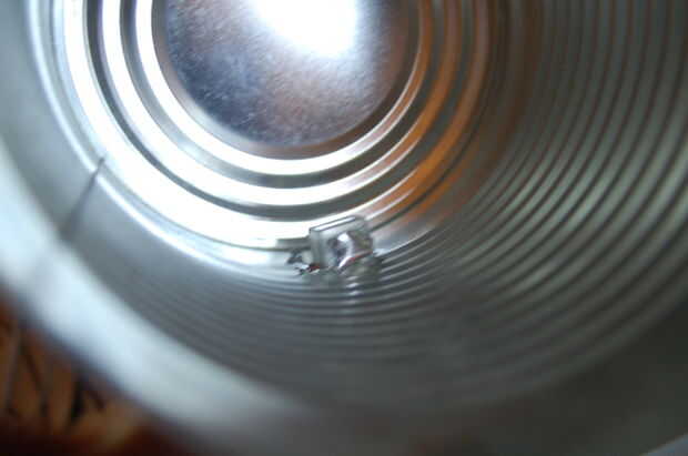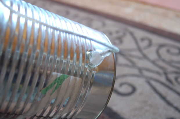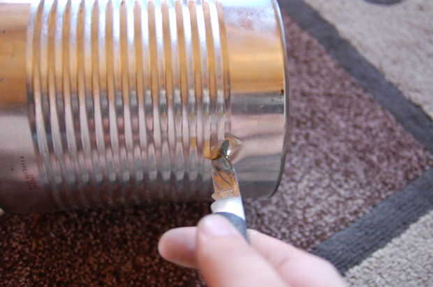 Corte un orificio en la lata hacia la parte inferior (ver imagen) apenas grande bastante que puede forzar el extremo hembra de la extensión USB cable en. Yo sólo apuñaló a mina con una navaja un par de veces. No quiero el cable para poder moverse en absoluto. Si haces el agujero demasiado grande, simplemente Envuelva el extremo del cable que usted se pegue en el agujero con cinta de pato hasta que es difícil de encajar en.
