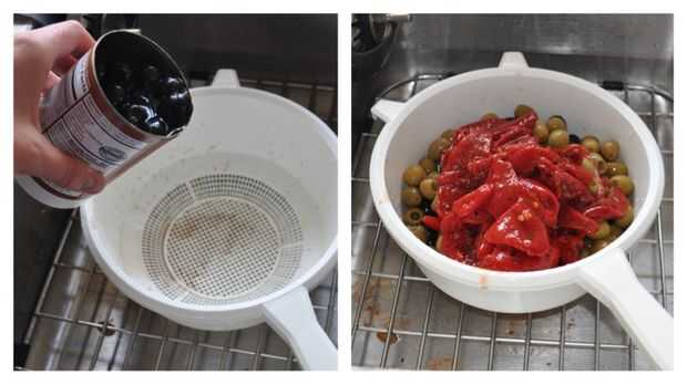 Abrir sus latas con el abrelatas. Vierta sus aceitunas y pimientos en un colador que en el fregadero. Colar los ingredientes agitando ligeramente el filtro.