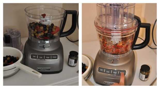 Vierta la mitad de la mezcla de oliva y pimienta en el procesador de alimentos. Picar primero. Prefiero Pulse pulso para comenzarla y luego manténgalo presionado. Vierta la mezcla restante en el procesador de alimentos y terminar para arriba.