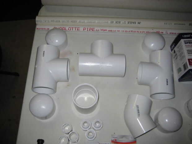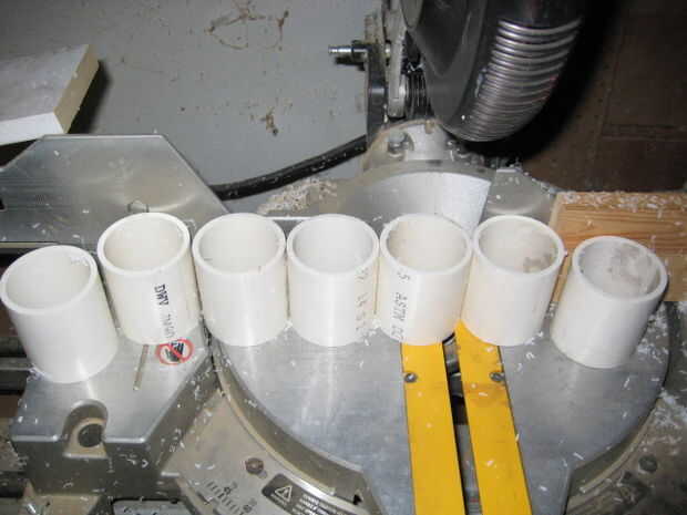 Usted necesitará cortar 7 la tubería de 2" . Cortar unos 2". Esto hizo que las juntas que se estaría haciendo al ras. (En hindsite, recomiendo doblarlos 4-6 pulgadas para dar una base más estable, a veces los niños se entusiasmen y tirón del cable del lanzador y puede volcar el lanzador)
