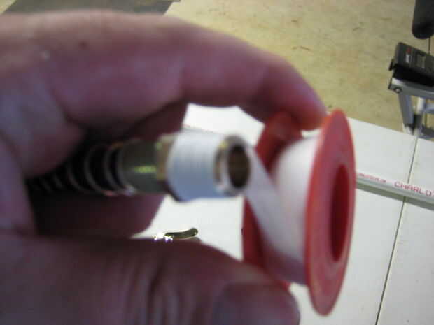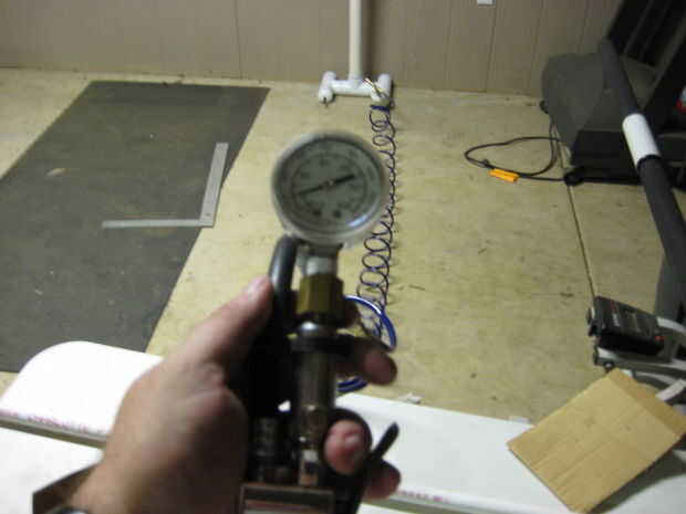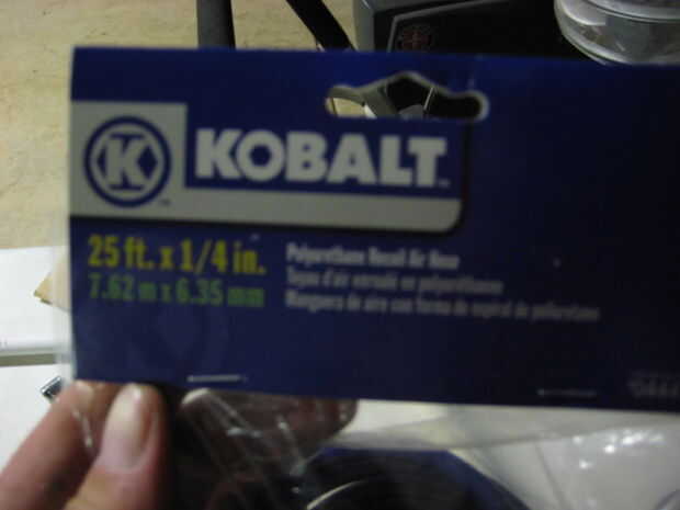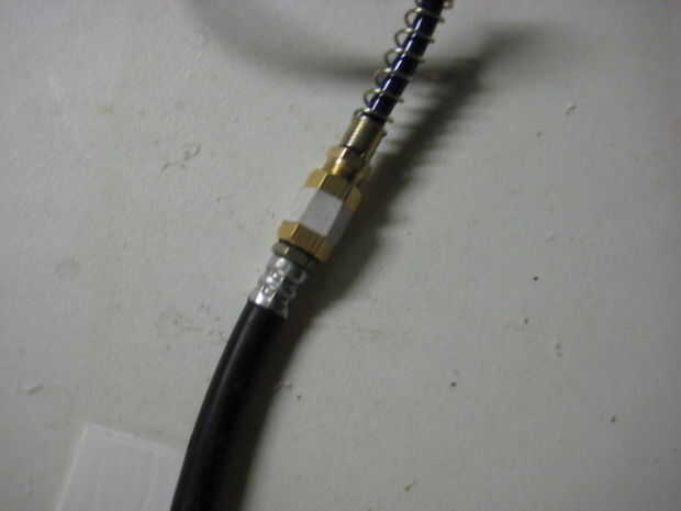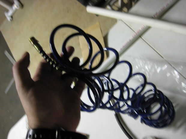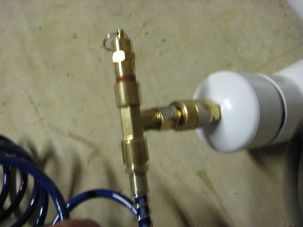 Así que esta bastante sencillo. Estamos creando una manguera que conecta con el compresor de aire que nos permitirá cargar la unidad. Lo configuro para que la válvula de control y el medidor en un extremo y el alivio rápido de presión y conectar en el otro. Esto pone el relleno a una distancia segura de la unidad. He usado la válvula de alivio porque los niños pequeños (los así como grandes) pueden emocionarse y olvide suelte el asa de relleno.