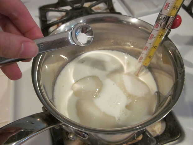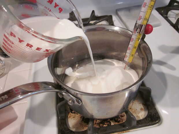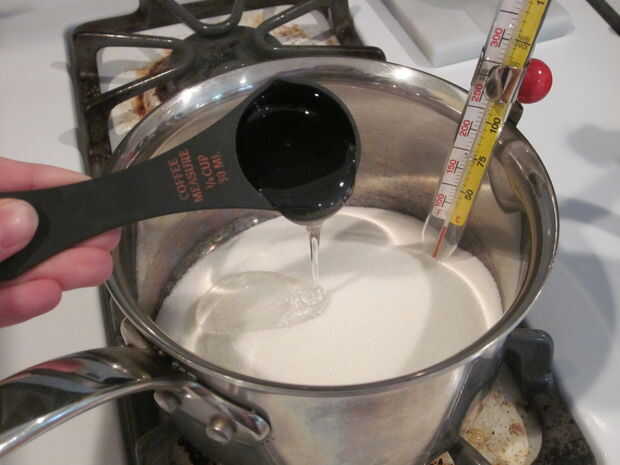 Tomar por lo menos una olla de 2 cuartos e Inserte un termómetro de caramelo (la mezcla comenzará a burbujear mucho, así que no utilice un cazo más pequeño). Añadir el azúcar, almíbar de maíz, leche y sal a la cacerola.