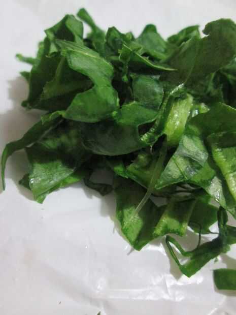 Cortar la hoja de acelga en tiras y luego superior en la superficie del pan uniformemente.