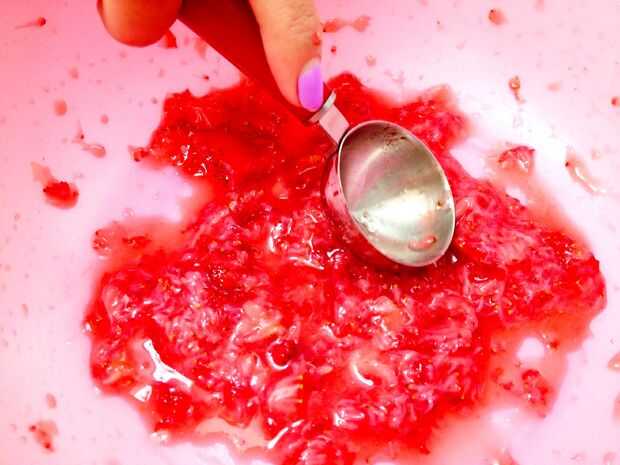 1. lavar las fresas y pelar hacia fuera de la hoja. 2. poner las fresas 100g en el Bol. 3. aplastar las fresas con tenedor o una cuchara o palita para hielo scream. 4. cuando su hecho, añadir el 3tbs azúcar y esencia de vainilla.