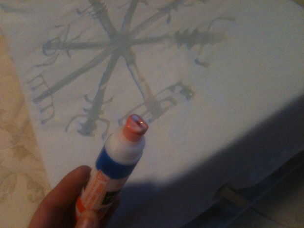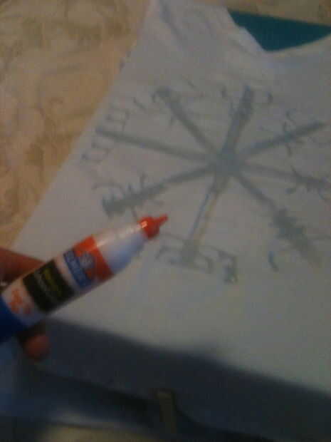 Cuando la tela está tirante y estable, dibujar su diseño sobre la tela con pegamento. Se siente muy similar al dibujo con pintura puff. Nota: No ser demasiado entusiasta con el pegamento-necesita una luz a media capa. Si pones demasiado en, no enjuagar y tendrás que lavarlo varias veces y luego raspar los bits restantes que es molesto.