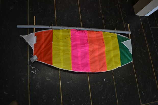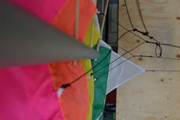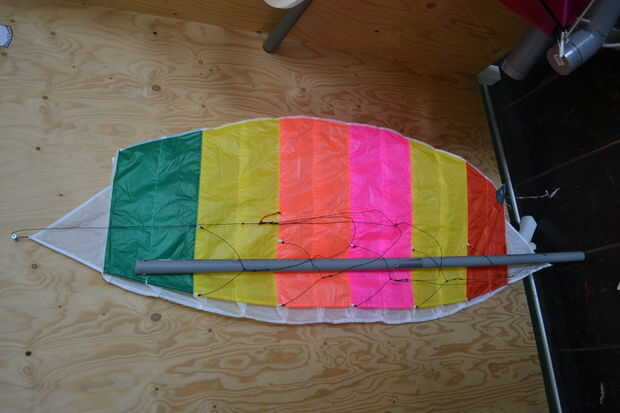 Paso 3, las barras de madera a través de los orificios en el tubo y en las cámaras de aire de la cometa de la fuerza. Las varillas deben tensar timwires alrededor del tubo.