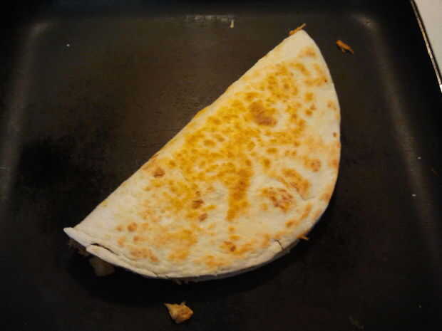 Después de hacer el doblez puede empezar la próxima quesadilla. Sólo poner todos los ingredientes a un lado y doblar derecha. Permiten un poco más sobre el segundo lado para brindar correctamente. Termina como una línea de ensamblaje y agiliza mucho las cosas.