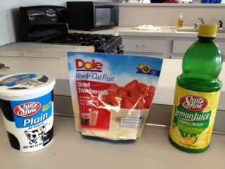 Todos los ingredientes necesarios para esta receta son las cosas que usted puede comprar en su tienda local de comestibles. paquete 1-16 onzas de fresas congeladas (o fruta deseada) 1/2 taza yogur llano, no en grasa 1/2 taza de azúcar 1 cucharada zumo de limón