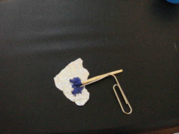 Poner el pedazo de papel de aluminio sobre una superficie plana y ponga el polvo en ella. Tomar un palo de fósforo y puesto en el polvo y utilice un alfiler o el clip de papel mismo y pt de la misma manera que puso el fósforo después de rodar el papel de aluminio con todo lo en ella como se muestra en la imagen.