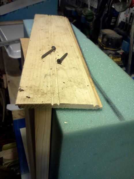 8. utilizando un par de piezas de madera hacen que desecho una base la anchura de su espuma y tornillo 2 piezas de madera de borde recto en la base que empareja los ángulos de los cortes.