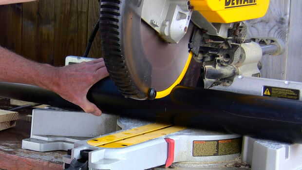 Una hoja de corte madera regular en un inglete Sierra es una manera fácil de cortar el tubo ABS.  Un serrucho trabaja demasiado pero es más difícil para hacer un bonito corte recto.  Después de cortar los tubos a la medida (de 24 pulgadas de la cámara de combustión y 36 pulgadas de cañón) quitamos las rebabas del tubo con papel de lija (un cuchillo o un archivo también hará).  No te olvides de usar protectores de ojos y oídos cuando utilice la sierra ingletadora.