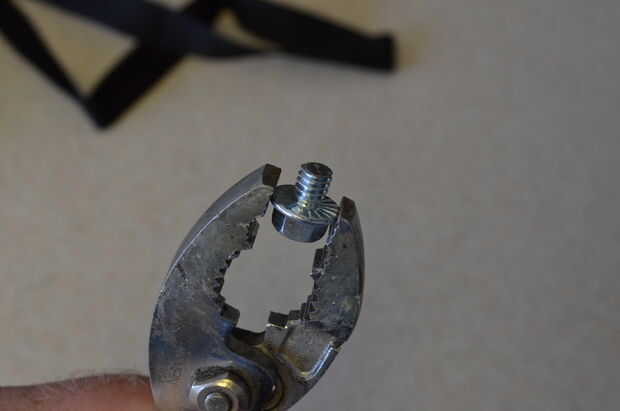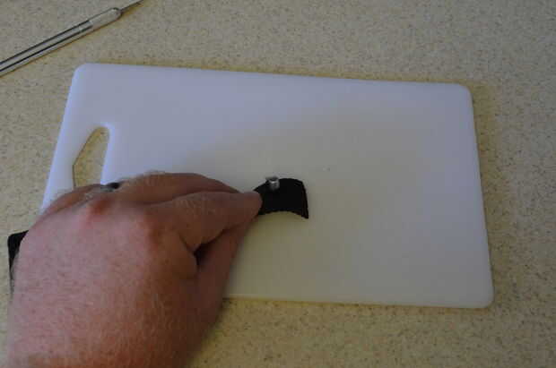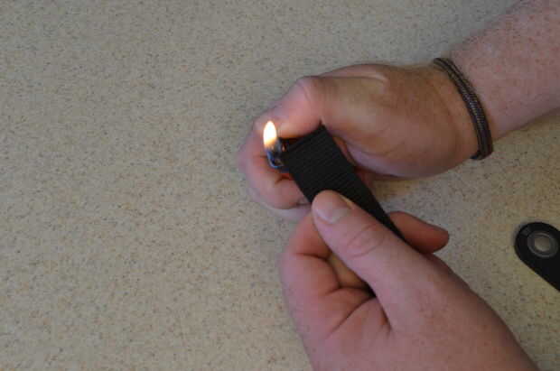 - Pasar el alumbrador alrededor del agujero para fundir los bordes deshilachados e introducir el perno mientras esté todavía caliente.