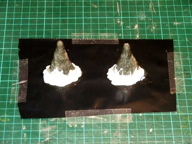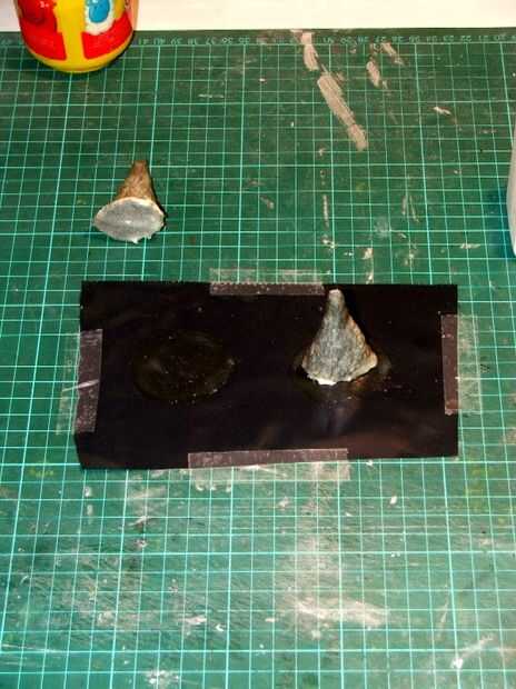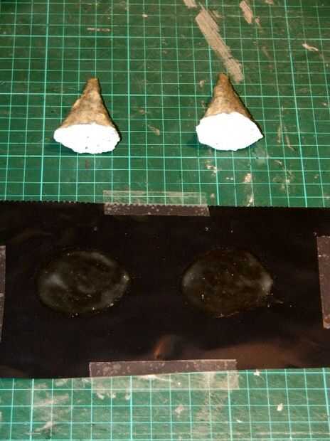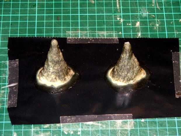 Ahora debe tener dos cuernos totalmente recubiertos en látex curada y dos bases de látex seco así. El látex se adherirá al instante con sí mismo incluso cuando está en este estado seco. Al igual que un pegamento de impacto. Cuidadosamente empuje cada cuerno abajo sobre él es la base de la hoja - se formará inmediatamente un bono.