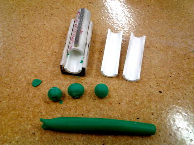 El concepto básico es que tienes un cilindro aserrado por la mitad longitudinalmente para darle dos cilindros medio. Ponga una cantidad medida de su medio (arcilla o arcilla polimérica) en el centro, frotar las dos mitades juntas y obtendrá una esfera perfecta.