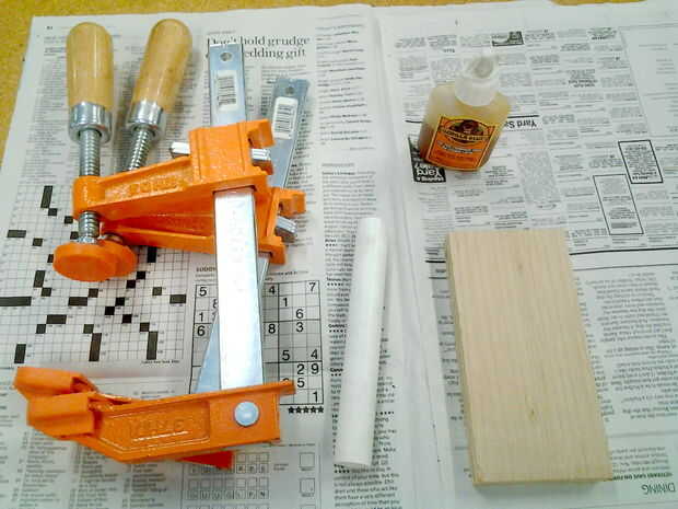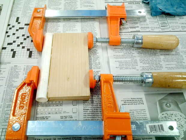Ahora lo importante es que queremos un corte recto. No queremos que el tubo gire en todos mientras que nosotros estamos cortando. Así que para paliar este problema, pegué el tubo de pvc a un pedazo de madera. Usé pegamento gorila porque hace espuma para arriba y hace más contacto con el tubo de PVC redondo. Yo dejar que este seque durante la noche y elegí el proyecto hacia atrás hasta el día siguiente.