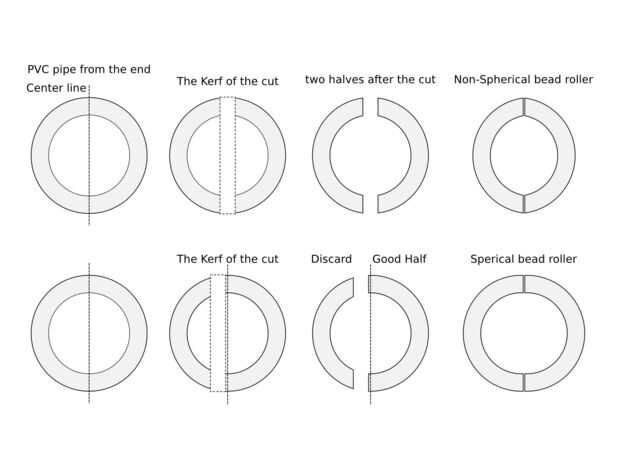 Corte es una palabra que voy a usar, y muchas personas no estén familiarizadas con el concepto. Básicamente es la cantidad de material extraído herramienta que se utiliza para cortar la herramienta. Sólo podríamos cortar el tubo de PVC y utilizar las dos mitades, pero luego terminaría con una forma más ovalada porque las dos mitades no sería perfectamente semiesféricas. Así, la parte más importante de este proyecto es que quiere ajustar para el corte. Mi solución es cortar apenas tímido de centro y tirar una pieza (la menor).