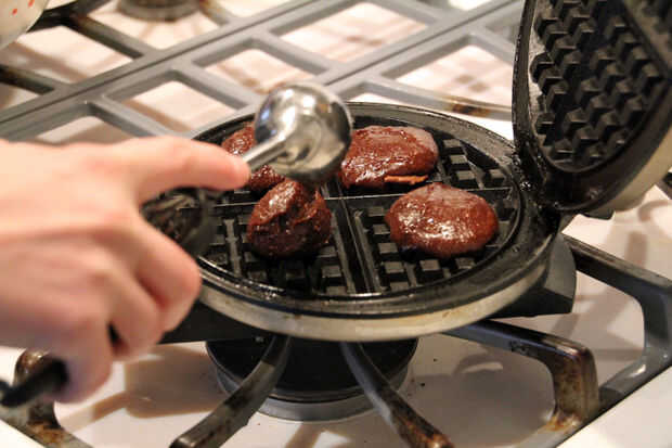 Me gusta utilizar una cucharada del helado / disher poner la mezcla en el molde para gofres. ¿La pala que utilizo es 1,75 pulgadas de diámetro (no supone que tienen números en ellos? No pude encontrar uno), y 4 bolas por galleta funciona bien para mi hierro.