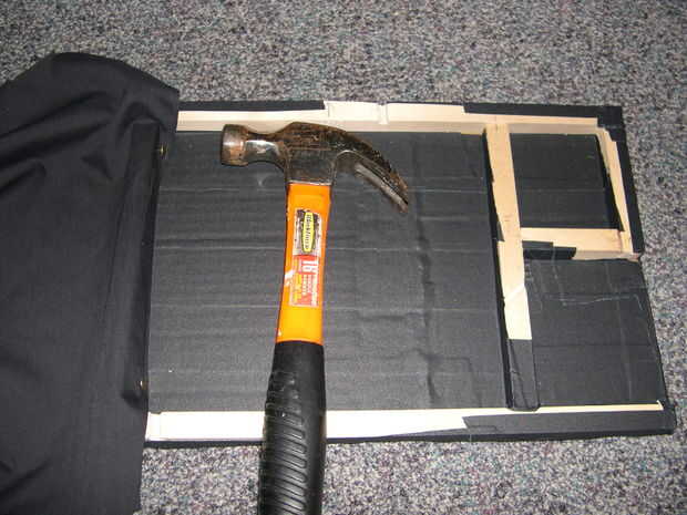 a continuación os adjunto paño en la base para cubrir la parte exterior. Me corte un pedazo de tela de aproximadamente el tamaño correcto y empecé con un lado conectarlo. Utiliza chinchetas para sujetar la tela en el interior de la base y tiró firmemente alrededor de la parte inferior había unido al lado opuesto. La madera era algo difícil para una tachuela para que alistó la ayuda de un martillo, a veces usando un trozo de la madera de 5/8" como un conjunto de uñas. Luego cortar la tela sobrante y con cinta los bordes de la tela.